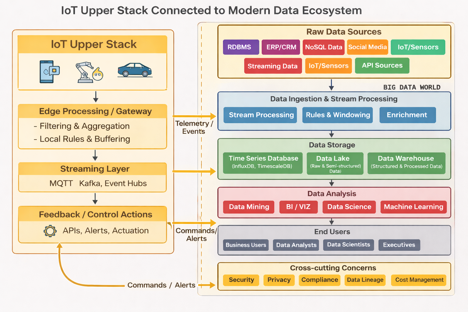 The upper stack deals with application, data processing, and user interaction aspects of IoT systems. It includes the following layers:
