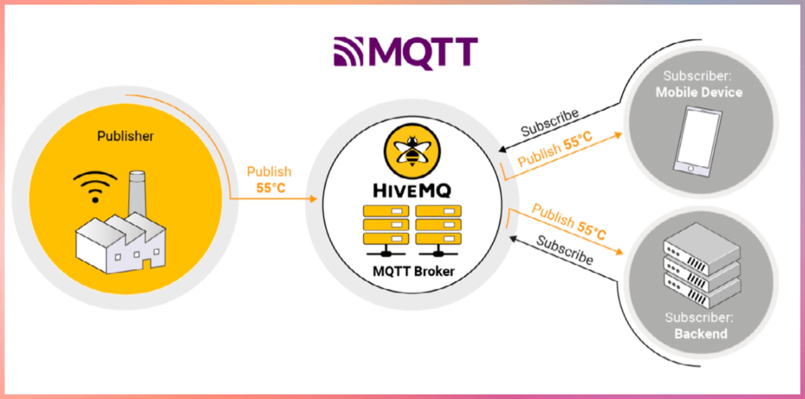 - Devices publish messages to a broker